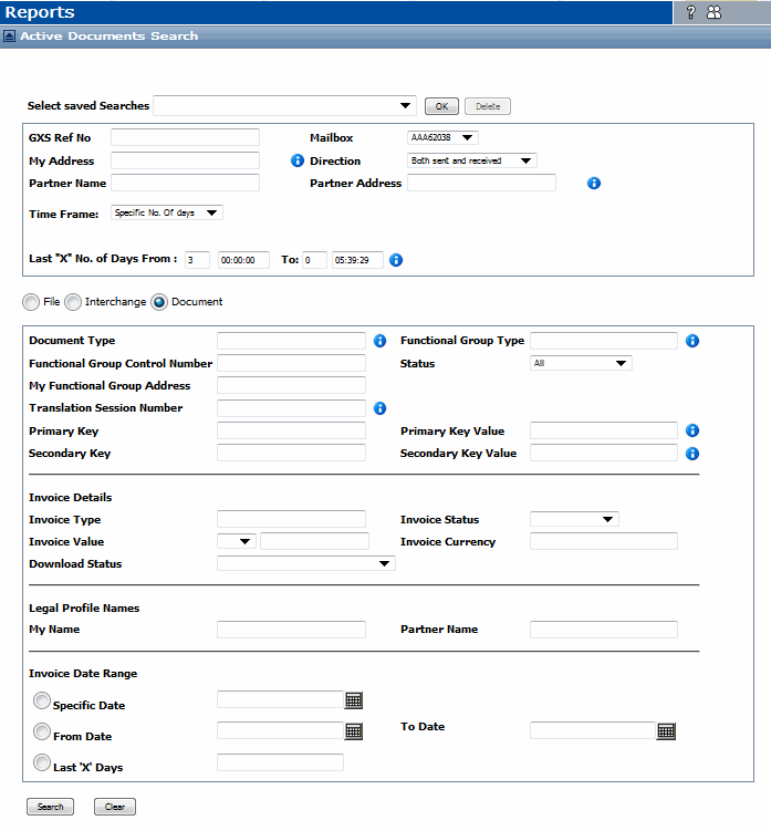 1 Click the Reports tab in Trading Grid Online.The Active Document Search page opens.
