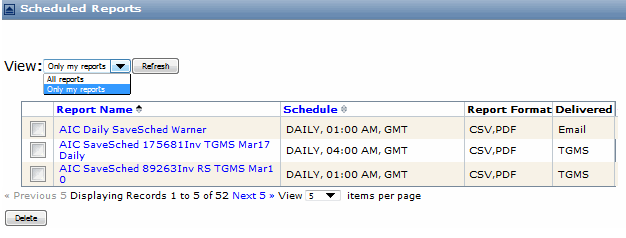 The Scheduled Reports page lists all of the reports that have been scheduled for delivery and the delivery status.