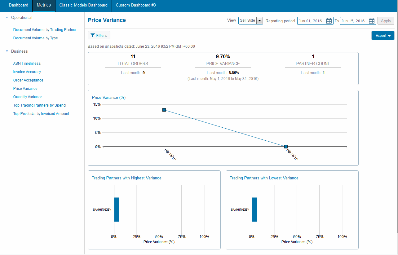 This note to be corrected in the next release.Price Variance Metrics Page Note: Depending on date range selected, the prior 30 days of data might not be available for viewing, and zero displays for the four components measured.