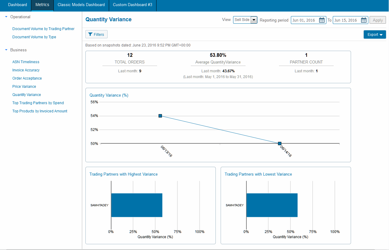 Quantity Variance Metrics Page Note: Depending on date range selected, the prior 30 days of data might not be available for viewing, and zero displays for the four components measured.