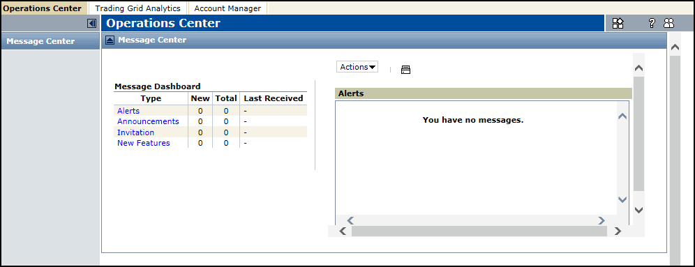 The Operations Center opens automatically when you log in to the system. This page is the home page for Trading Grid Online and it is available to all users.